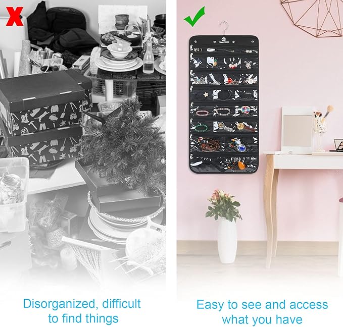 - PUT EVERYTHING IN ITS PLACE: Forget messy jewelry boxes, missing earrings, tangled necklaces. This handy hanging jewelry organizer will help you to sort, store and display your jewelry and never waste another minute looking for misplaced rings digging through impractical jewel boxes.