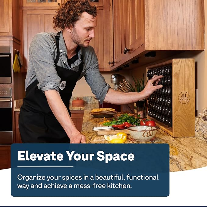 - 30 Jar Spice Rack Organizer - Simplify and elevate your herbs, spices and seasonings organization with an AllSpice Wooden Spice Rack. Complete with 30 4oz / 1/2 c refillable empty glass jars and three lid variations, including shaker and scraper tops