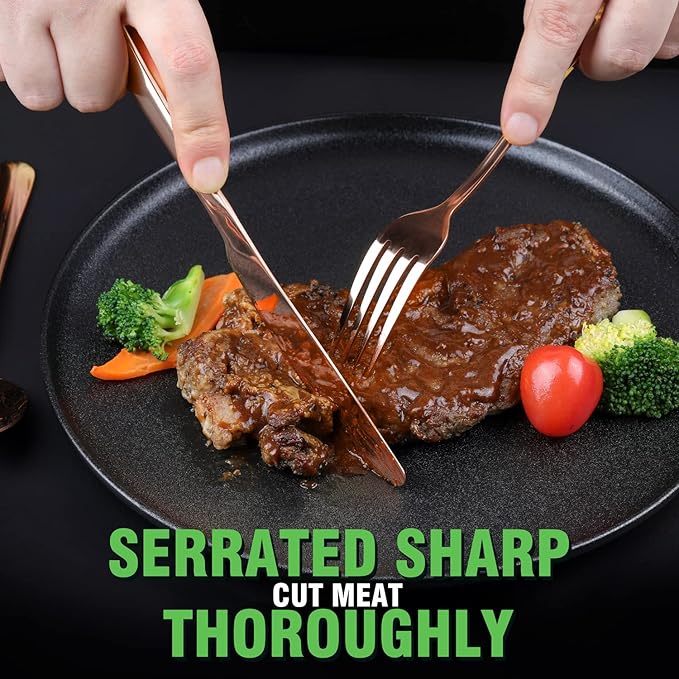 - 【GORGEOUS AND BEAUTIFUL APPEARANCE】: The high-grade mirror polishing process makes the surface of the knife and fork soft and smooth. This copper/rose gold silverware set has good reflective properties, will shine with a copper/rose golden glow to add brilliance to your dining table.