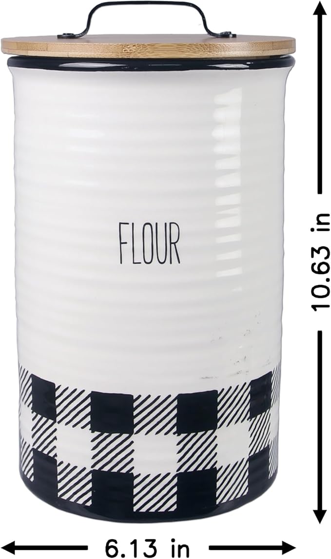 Young's Inc. 4 Pcs Set Plaid with Bamboo Lids Ceramic Canisters- Storage Container for Kitchen and Bathroom - Beautiful Home Decor Accent to Store Food, Coffee, Tea, and More - Black, White