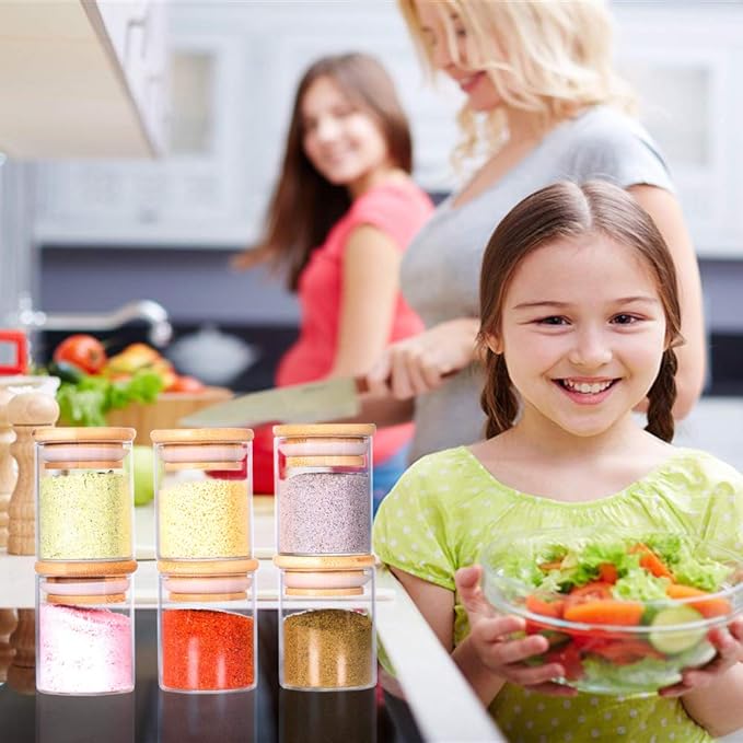 - 【EASY TO CLEAN】I think spice jar set can be washed with water and dishwasher, while wooden lids can be wiped with cloth.This will save you more time.