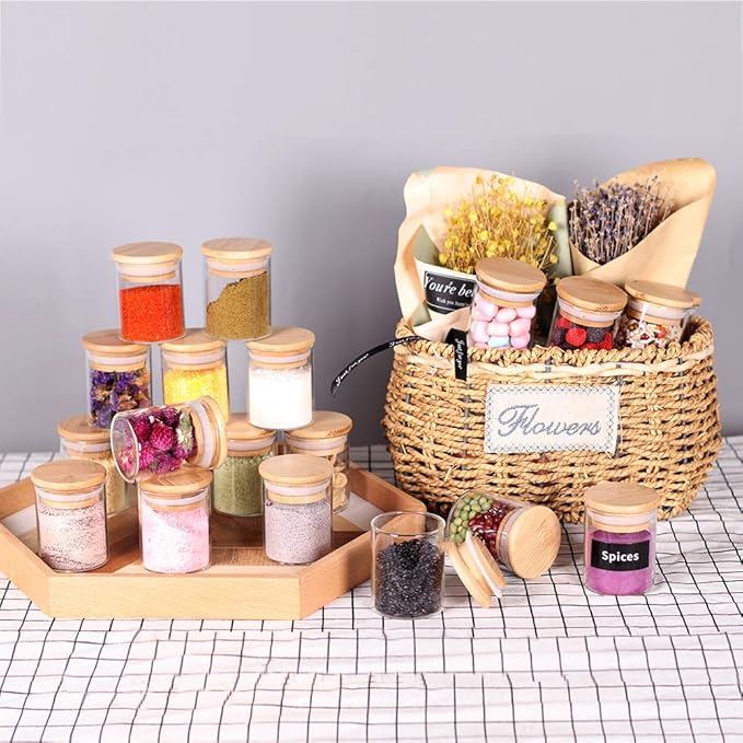 Spice Jar Set,2.5oz 20 Piece Glass Jar with Bamboo Airtight Lids and Labels, Mini Clear Food Storage Containers for pantry, kitchen canisters for Tea, Herbs, Sugar, Salt, Coffee