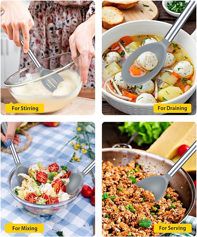 - Just Want To Provide The Ideas For You : Large cooking spoon used to hold food more convenient; Slotted Spoon can quickly drain the water; Whether it is used for draining or serving food, our large silicone cooking spoon will add more fun to your kitchen