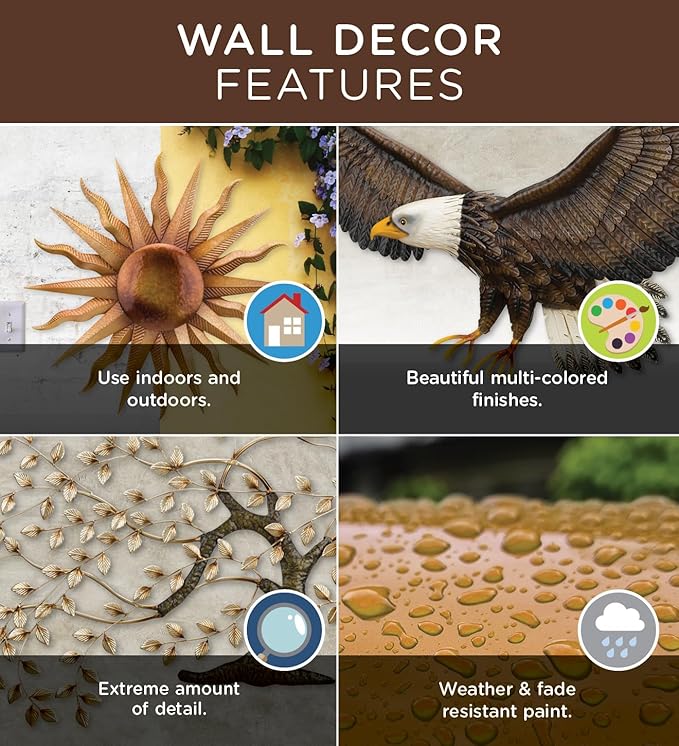 - WEATHER & FADE RESISTANT – Crafted for durability, this piece features a high-grade, weather-resistant coating. The protective finish resists fading, and other elemental wear, ensuring your outdoor wall art retains its vibrant look season after season.