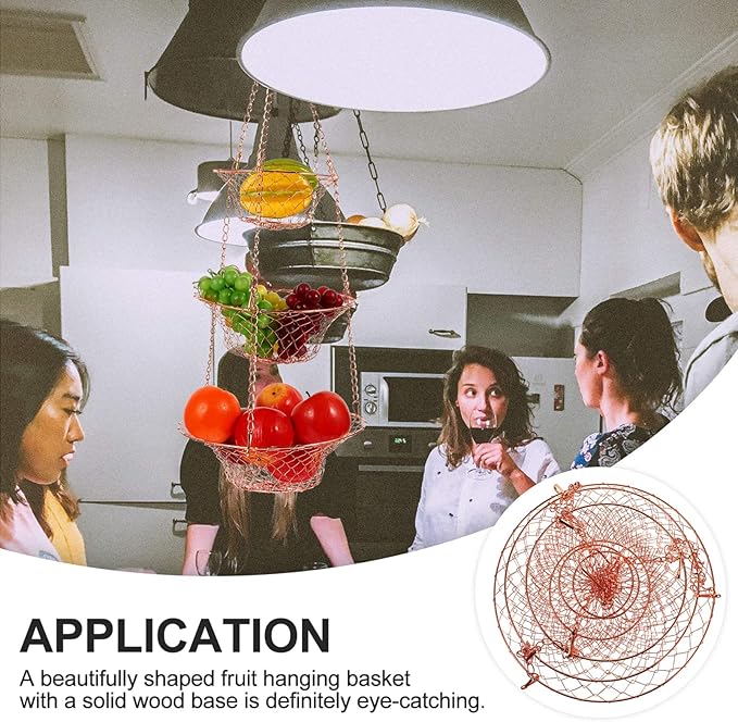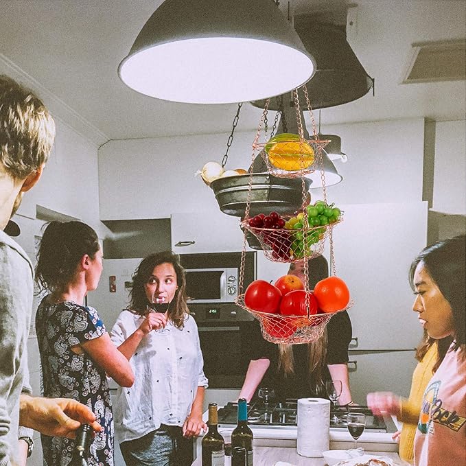 Yardwe 3 Tier Hanging Fruit Baskets Copper Wire Basket Fruit Vegetable Kitchen Storage Organizer Rustic Country Decor Round Metal Copper