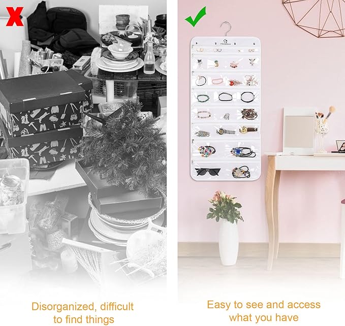 - 2 VERSIONS TO CHOOSE FROM: In addition to the 50 pockets version, we offer an alternative hanging jewelry organizer with 25 transparent pockets and 23 Hooks! Choose whichever fits you and put all your rings, earrings, lockets, necklaces, watches, brooches, pins and other jewelry in order!