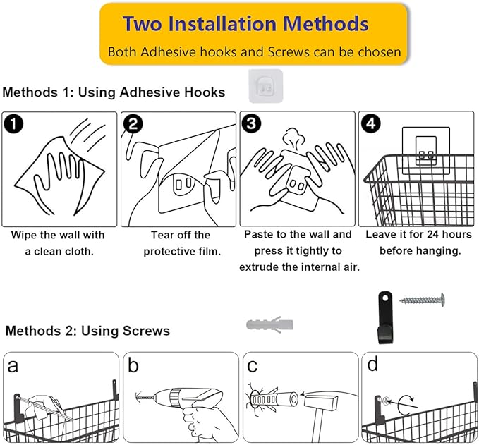 - ๐ใSturdy wire baskets that can hold 50 poundsใ These baskets are made of durable steel wire with durable anti-rust and anti-corrosion coating, as well as wall-mounted hardware and hooks, which can hold 50 pounds. (Note: If you use non-marking paste instead of screws, the basket can hold 11 pounds)