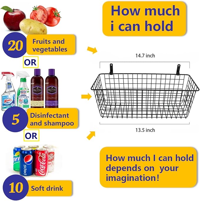 - ๐ใMake good use of the remaining wallใcan be used on any wall in the home, such as storage rooms, kitchens, bathrooms, bedrooms, RV, courtyards, doorways, garages, offices, etc. These wall hanging baskets can support various items without being bent by weight, such as fruits, vegetables, snacks, spice jars, books, folders, magazines, bathroom accessories, toiletries, tools, etc.