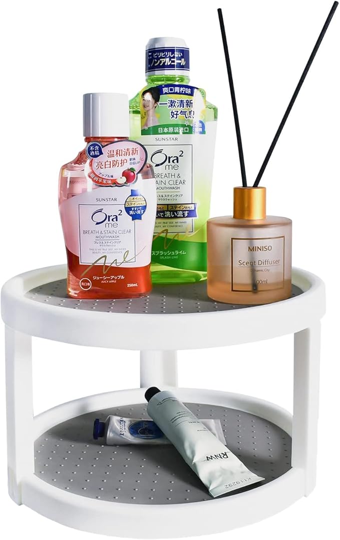 - Two-tier Large Capacity: Turntable organizer has two tiers to help you get the most out of your limited space. Two-tier turntable makes it easy to organize more bottles in the kitchen or bathroom; fits standard cabinets. Cabinet organizer perfect to save your space and store more items in the same small area. Cabinet organizer perfect for organizing your kitchen, refrigerator, bathroom, pantry, home office, laundry room, garage, craft or bathroom cabinets, and more