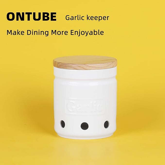 - FASHIONABLE APPEARANCE : This Garlic Keeper adopts a straight barrel design, combined with a cover to make its appearance look more fashionable. There are 5 holes on the porcelain, which can keep the garlic ventilated inside