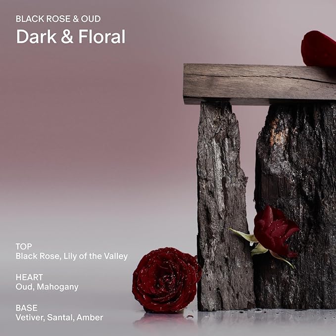 - Black Rose & Oud — This scent is dark, floral, and sensual. It's moody and fresh, like strolling through a patch of blooming black roses at night.