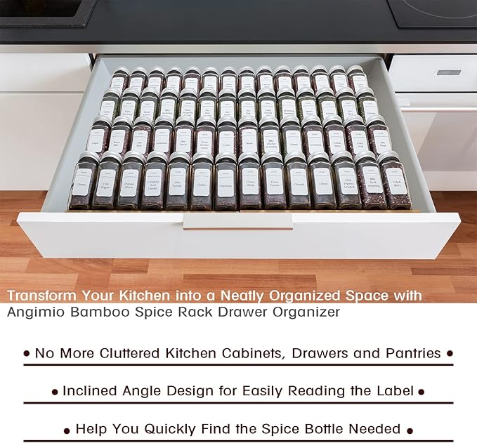 - NIFTY BAMBOO SPICE RACK ORGANIZER – A cluster of jars on your kitchen counter or drawer arranged haphazardly isn’t a sight that anybody would like to deal with! Keep your spices handy and neatly arranged with Angimio Bamboo Spice Rack Drawer Organizer.