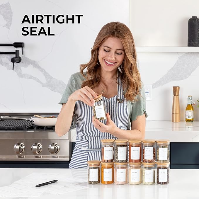 Empty Spice Jars with Label Pack (12x Bamboo Lid Glass Jar). Small 6oz Spice Storage Bottles with 112 Printed Stickers and 48 Writable Pantry Labels for Seasoning Containers