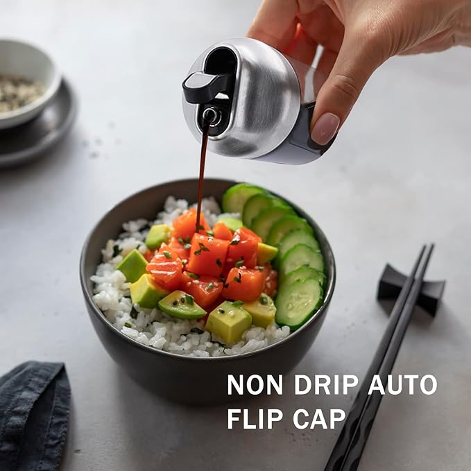 - No Drip Soy Sauce Dispenser: The no drip spout allows you to control the exact amount of oil, and oil will not drip out of the spout, keeping the bottle and countertop clean. This container fits 7oz of light or dark soy sauce and is the ideal size for single-handed control. No more lifting large and heavy bottles or losing caps.