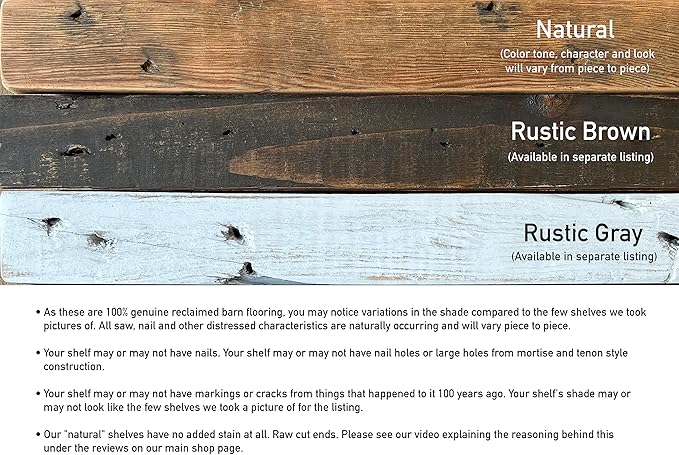 - Please note: The coloring of these shelves is Natural. They are not stained or finished in any way. All coloring is naturally occurring from decades in a working barn. When shelves are cut to size, the ends may be lighter or a different color, as the inside of the shelf has not been exposed to the elements of the barn. Please be sure to look at all of the listing pictures.
