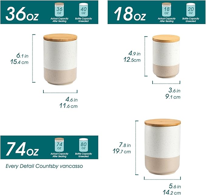 - 【3 Sizes for Versatile Storage】This set includes 3 canisters in different sizes (4.9"x3.6", 6.1"x4.6", 7.8"x5.6") with capacities of 18 oz, 36 oz, and 74 oz. Perfect for storing flour, sugar, coffee, tea, spices, and more. Note: Solid storage capacity may vary due to density differences