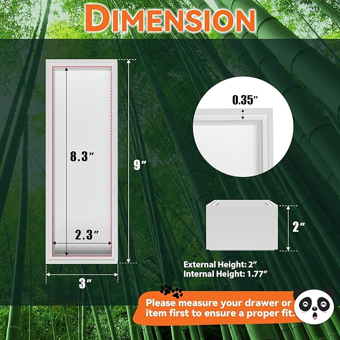 - Each bamboo drawer organizer measures: external size: 9" L x 3" W x 2" H; internal size: 8.3" L x 2.3" W x 1.77" H. Please check the size before purchasing