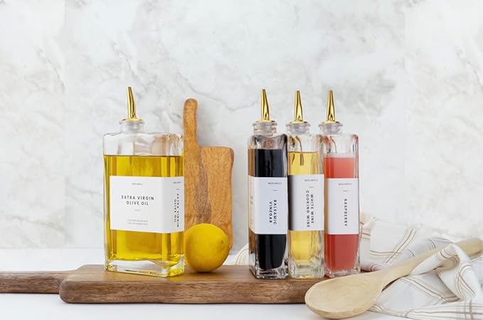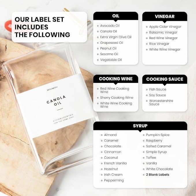 - Labels Free of Oil Stains: Each Oil and Vinegar Dispenser Set Has 42 Complimentary Waterproof Stain-free Labels. The Labels Are Designed To Be Reused for Multiple Times and Will Not Leave any Residue upon Peeling.