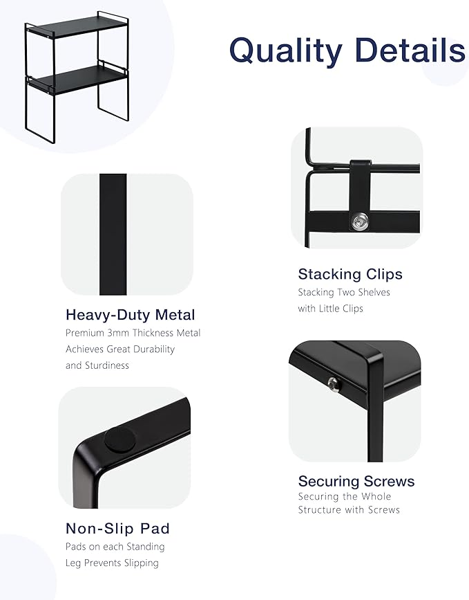 Nxconsu 2Pack Cabinet Shelves Stackable Organizer Rack Riser for Kitchen Cabinet Pantry Cupboard Counter Countertop Home Organization Storage Space Saver Heavy Duty Metal Nonslip Black Tall