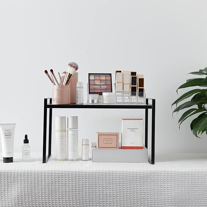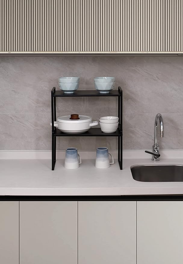 - CHARACTER DESIGN: This cabinet shelf can create plenty of space for your household items such as cups, pots, bottles, bowls, cookware, or canned foods without dominating space in your cabinet. This stylish cabinet shelf fits neatly on the countertop to keep your essentials organized and easily accessible.