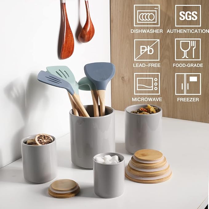 Sweejar Kitchen Canisters Ceramic Food Storage Jar Set, Stackable Containers with Airtight Seal Bamboo Lid for Serving Ground Coffee, Tea,Grains, Herbs,Sugar, Salt and More - Pack of 4(Gray)
