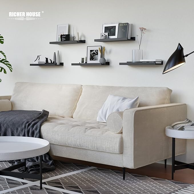 RICHER HOUSE 5 Set Floating Wall Mounted Shelves, Black Shelves for Wall Decor, Modern Picture Ledge Shelf with Lip for Storage, Nursery, Bedroom, Living Room, Bathroom - Black