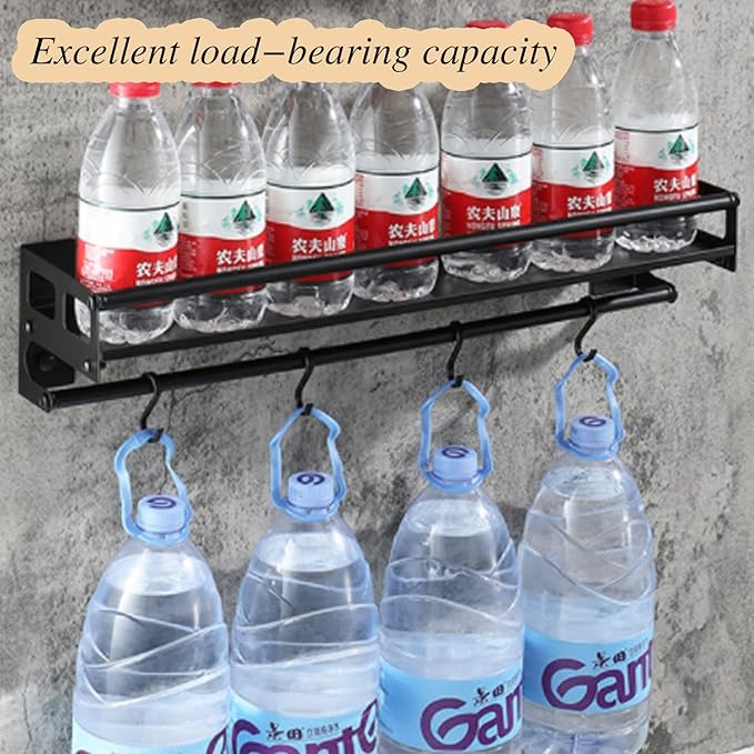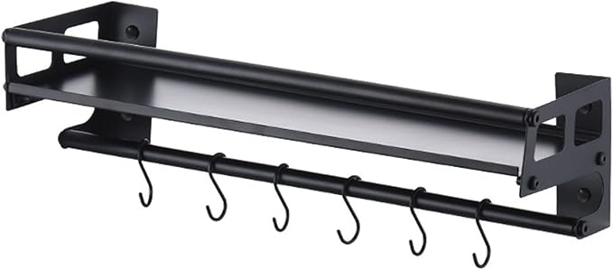 Wall Mount Storage Holder,Stainless Steel Strong Shelf with 6 Removable Hooks, Spice Rack Organizer,Kitchen Organizer Shelf, Space Saving Spice Rack and Kitchen Storage (black)