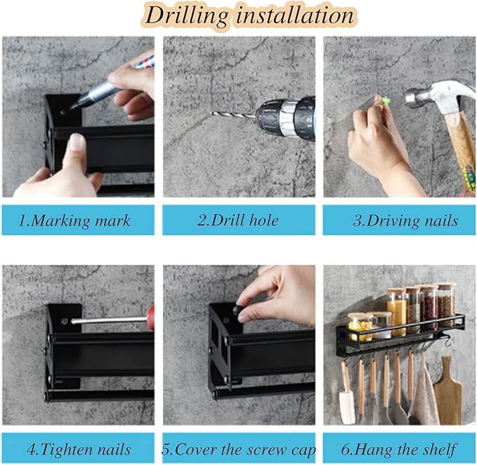 - 【6 Removable Hooks】This spice shelving unit comes with 6 removable hooks that is very convenient for scissors, measuring cups/ spoons, oven mitt, keys, sunglasses, pot holders, etc.