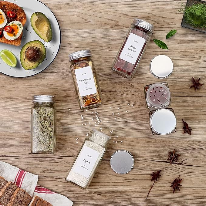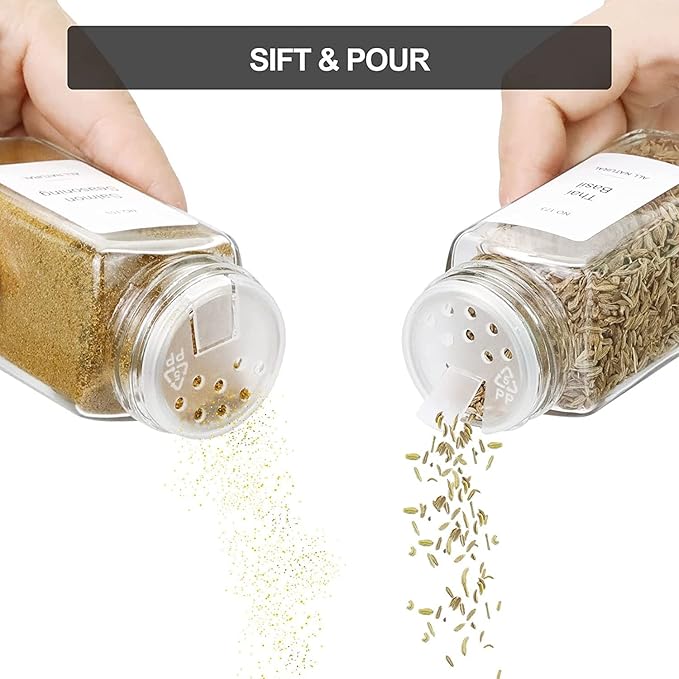 - 28 Glass Premium Spice Jars: Spice jars are made of lead-free glass, safe and shatter-resistance.28 dual functioning sift and pour lids; let you shake or use spoons to measure. The airtight aluminum caps protect prepared spices not exposed to air, keeping spices aromatic and flavorful.