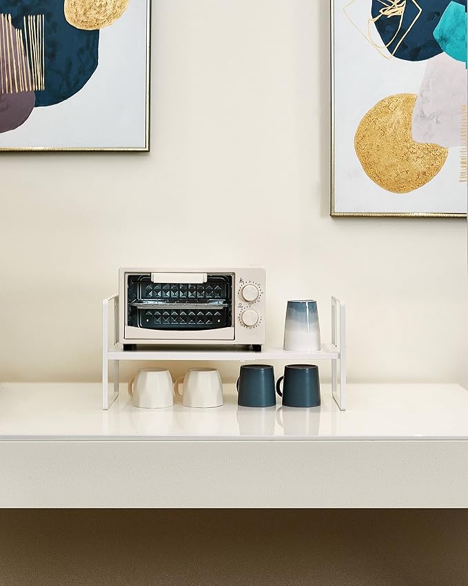Nxconsu Cabinet Shelf Expandable Height Adjustable Organizer Riser for Kitchen Cabinet Pantry Cupboard Under Sink Countertop Organization Storage Space Saver Stackable Heavy Duty Metal White