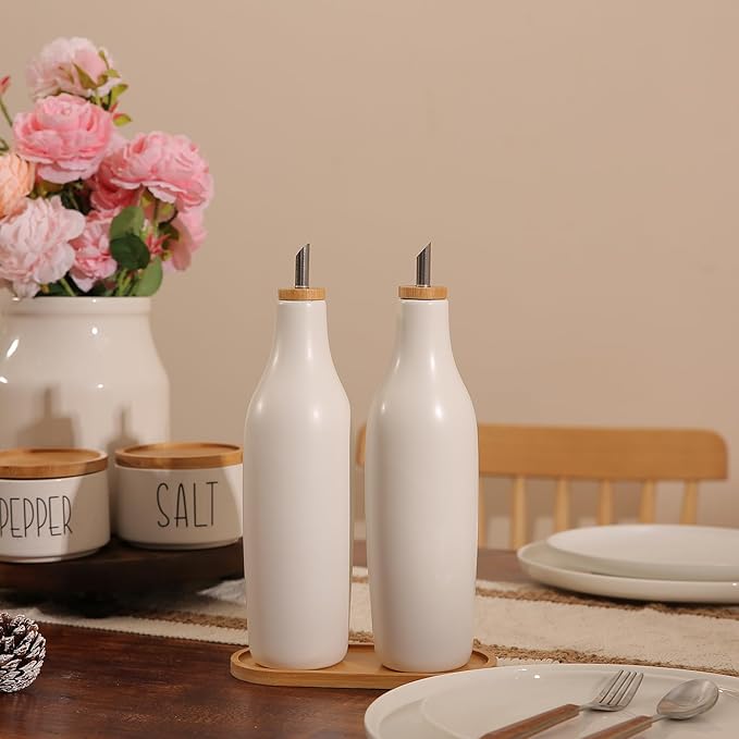 - KITCHEN OLIVE OIL DISPENSER - 16.9 fluid ounce (500 ml) Ceramic olive oil dispenser bottle with bamboo cap and stainless steel cruet spout, Works great as a kitchen oil dispenser for Olive Oil, Vinegar, syrups and more.