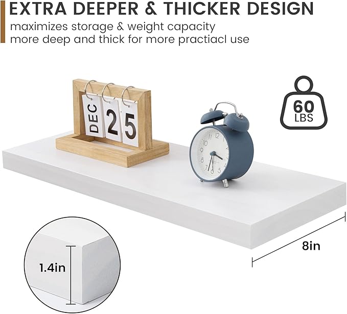 - Extra Deeper & Thicker for Storage - Each board measures 24"W x 8"D x 1.4"H. Extra deeper and thicker design in order to bring maximizes storage space and weight capacity, even hold up to 60 lb. This floating shelf taking up zero square feet, reduces clutter and highlights décor in compact spaces. It can help make full use of the empty wall, making it much more space-saving and making your room look larger and tidier.