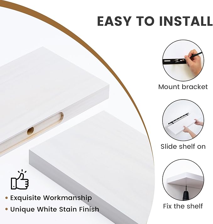 - Heavy-Duty Mounting Support - Our flush mount design ensures a seamless and visually pleasing installation, with the shelf appearing completely vertical to the wall. The bracket remains invisible, adding to the aesthetic appeal of your decor. To prevent any sagging, our shelves feature slightly upturned rods that provide reliable support for the board. Our thoughtful design ensures that your shelves remain securely in place, providing peace of mind while highlighting your beloved items.
