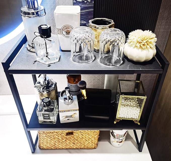 - Modern and Multi-Functional: The sleek satin black finish and tiered design make this shelf an excellent home decor piece that can be used as a cosmetic organizer, spice rack, or stylish display in any room