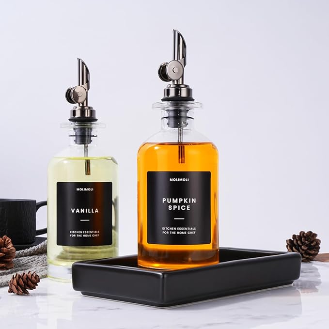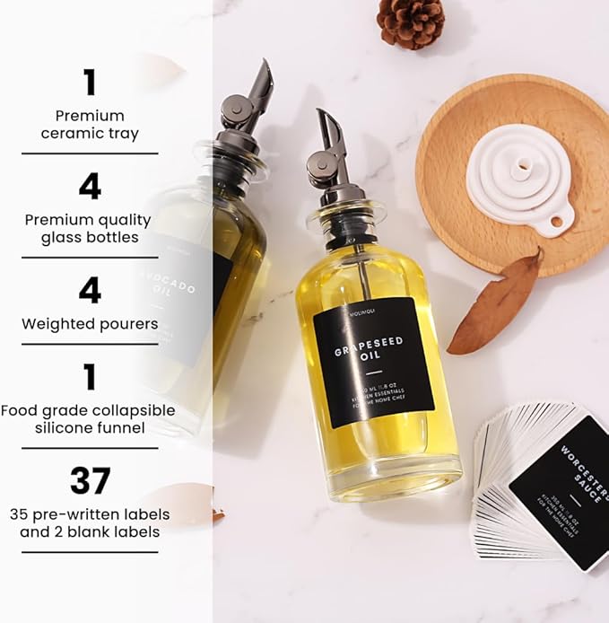 - Modern Kitchen Essential: Minimalism Inspired Cooking Oil Dispenser Bottle. This Set Includes Two High-quality 11.8 Oz (350 Ml) Glass Bottles, Two black Pourers, a funnel, and a 22 Label Set. If you received white label set, please contact us at hello@officialmolimoli with your order #, we will send a black set to you ASAP.