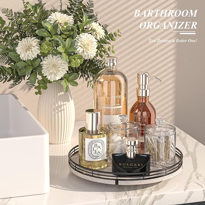 - πππππππππ πππ:This lazy susan is enough to be used nearly anywhere, perfect in the bathroom, bedroom, laundry room, office, etc. Keep your bathroom counter organized with this bathroom tray for toiletries, lotion, washcloth, cotton swabs, soap and scrubber. Using a bathroom vanity tray to keep all your daily skin care and makeup. On the bedroom counter, ideal to organize perfumes. Good idea for the office desk and craft room to organize. Keep your coffee stuff perfect at your coffee Station.