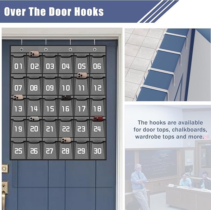 - 【4 Metal Hooks for Classroom Pocket Chart】 Calculator Phone pouch fit the top of whiteboard or over the door as thick as 1.3"-2", hanging organizer with pockets supports the weight of 30 phones (about 20 lb), easy to install and close the door