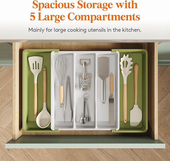 - Efficient and Versatile Storage: This 5 compartment flatware organizer for drawer categorizes and neatly stores utensils, making it easy to pick up what you need. Not only for kitchen utensils, it can also be used in drawers in other rooms to store various small items.