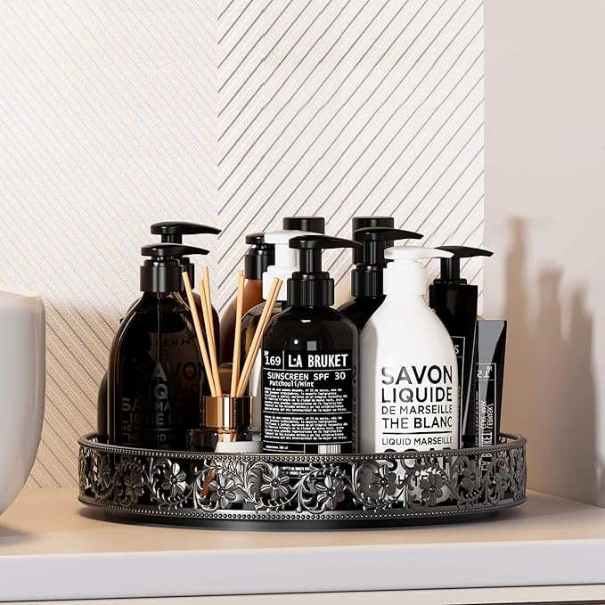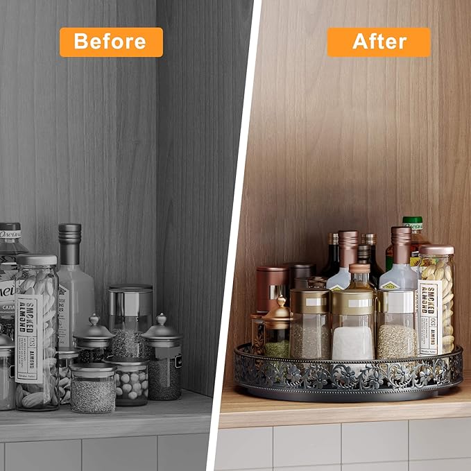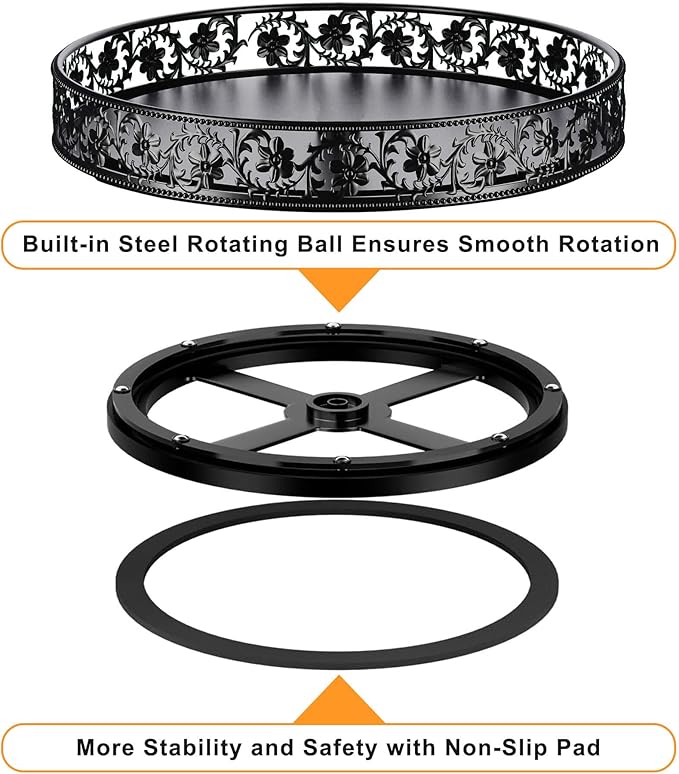 - 【Design with Floral Raised Edges and Open】The lazy susan for cabinet heightened edge with beautiful classic flower design not only provides exceptional decorative visual, but also prevents items from falling when rotating, it's safer to move the lazy susan organizer tray from one place to another.The open design of turntable organizer makes items clearly visible and easy to access and use.
