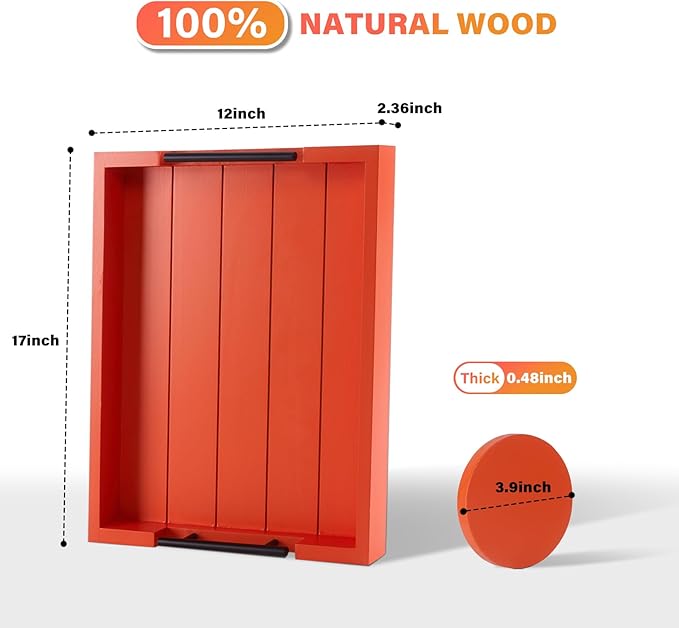 Ottoman With Handle for Living Room - Set of 4 Natural Wooden Coasters - Rustic Serving Tray for Coffee Table - Kitchen Decorative Tray With Handles (Orange)