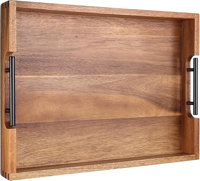 - Sleek and Functional Serving Tray: At 16.7 x 12.8 inch, this serving tray features metal handles for easy carrying; Its rich wood grain texture creates a harmonious aesthetic, making it a thoughtful and practical contribution