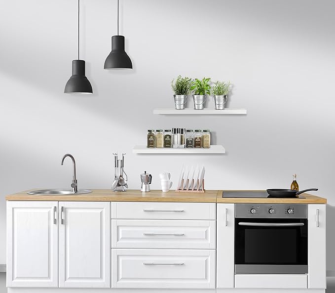 - Versatile & Functional Floating Wall Shelves: Install these floating shelves in the bedroom or bathroom to hold beauty/hair products - Place your wall shelf under a mirror in the entryway or exhibit family photos gallery style in a long hallway - Use as bathroom shelf, book shelf for wall, wall decor for bedroom, over the toilet shelf, kitchen floating shelves, floating nightstand, kitchen decor, living room wall decor, display shelf, and more