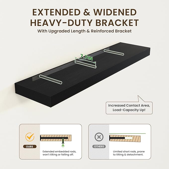 - DEEPER & THICKER SHELF- Our floating shelves measure 55W x 11.6D x 2H, deeper and thicker than usual wall shelves, which create more storage and display space for your home