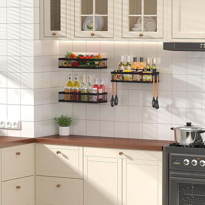 - 【MULTI-PURPOSE&MULTIFUNCTIONAL】The perfect solution for organizing a multitude of every items indoor or outdoor. The cabinet organizer hanging baskets wall mount is Ideal for organizing and storing spice bottles, pantry items, snacks, toiletries, tools, craft supplies,etc. And this metal bin basket free up enough space for your homes, kitchen, living room, bathroom, camper, farmhouse, apartments, college dorm rooms, etc.