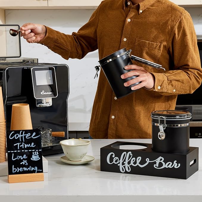 - SEALS WELL & AVOIDS SUNLIGHT: this stainless steel coffee container has a metal lock and a silicone gasket, which not only meets the storage of sunlight avoidance food, preventing coffee and other food from accelerated deterioration due to sunlight, etc., but also this design makes it easier for the user to open and close the container, and also prevents moisture from entering in the air to avoid harmful oxidization and keep the jar dry, which helps to keep the freshness of the coffee beans.
