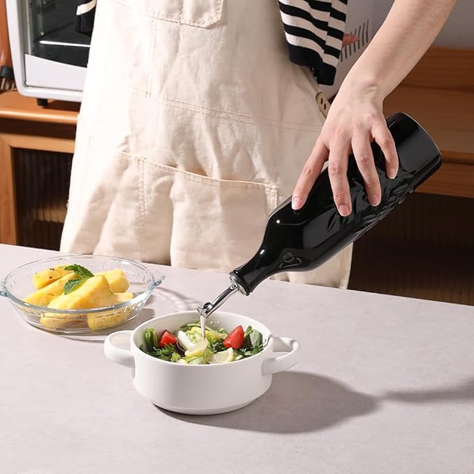 - Modern Relief Design -The bottle body is embossed with olive leaves, which looks elegant and delicate.Precision dumping, bottle body design has a unique spout, can perfectly pour out the oil and vinegar will not leak, the correct control of the use of oil.