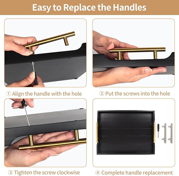 - 【SELECT YOUR HANDLE COLOR】Why not cost one money to get double happiness? Try our deluxe large black wooden tray for ottoman with 2 sets of metal handles. Now we offer two colors premium polished gold and silver for replacement. Let's test your operational ability with the fantastic wood serving tray.