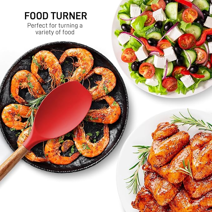 Zulay Kitchen Utensils Set Non-Stick Silicone Cooking Utensils Set with Authentic Acacia Wood Handles - 5 Piece Silicone Utensil Set - Silicone Kitchen Utensils Set with 464°F Heat Resistance - Red