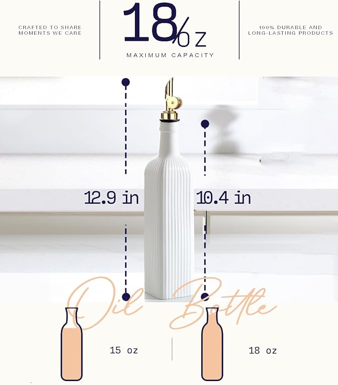 - [Elegant Design] A sleek white ceramic cooking oil dispenser with embossed stripes, creating a visually appealing and tactile experience for your kitchen or dining table
