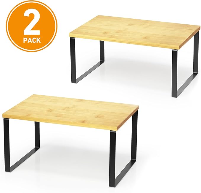 SpaceAid Cabinet Shelf Organizers 2 Pack, Kitchen Counter Rack Shelves Riser, Stackable Expandable Spice Rack, Pantry Cupboard Storage Organization (Black and Natural, Short)